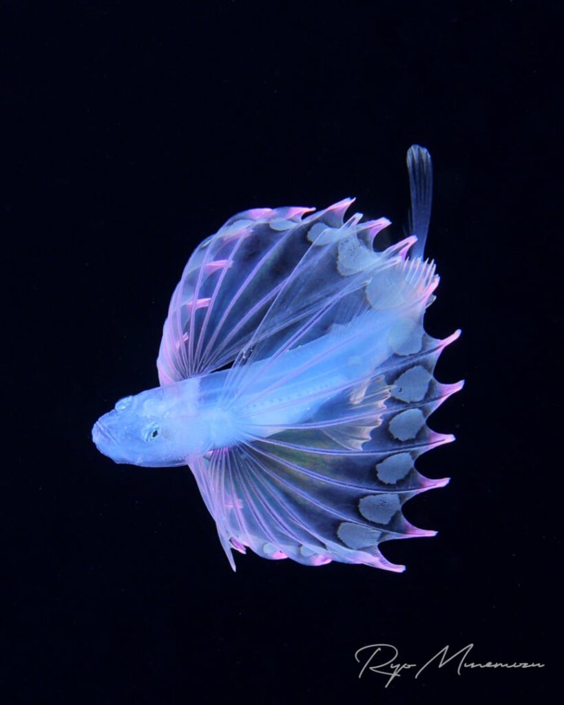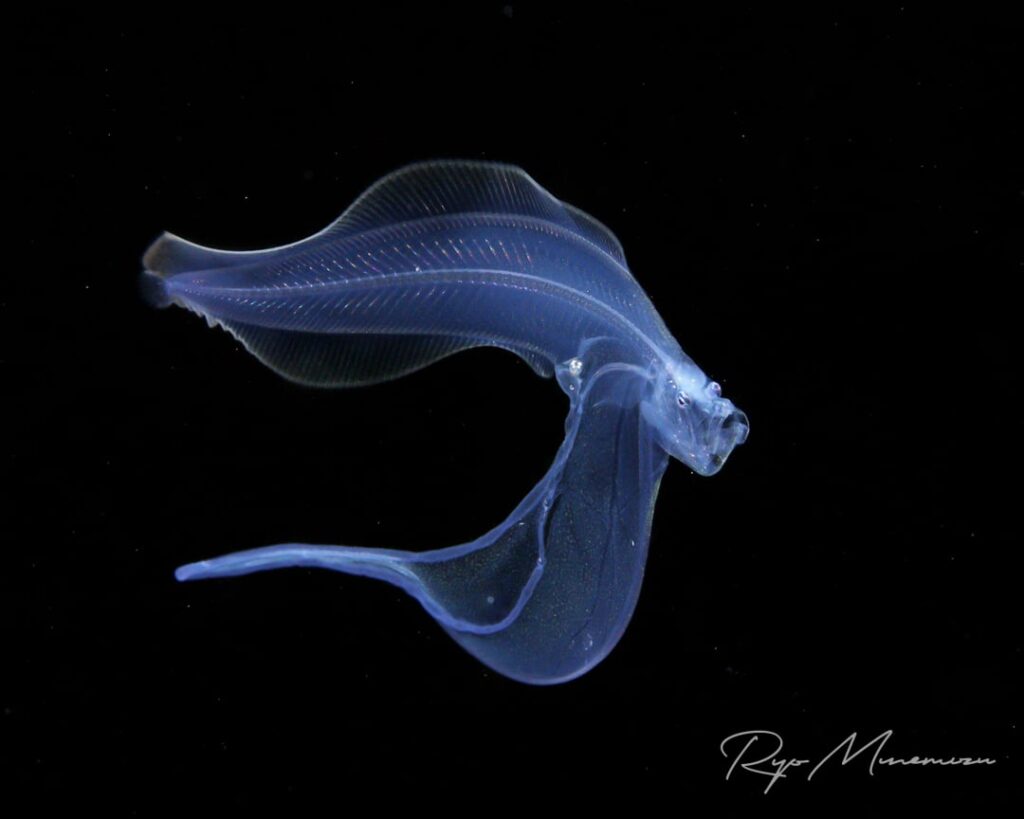 ライトは単なるブイの目印としての用途であり、ライトで生物を集めているわけではありません。手元のライトを頼りに真っ暗闇の中を泳ぎまわりながら生物を探します。これにより、国内初となる貴重な魚類の稚魚や、新種クラゲの発見にもつながっている。